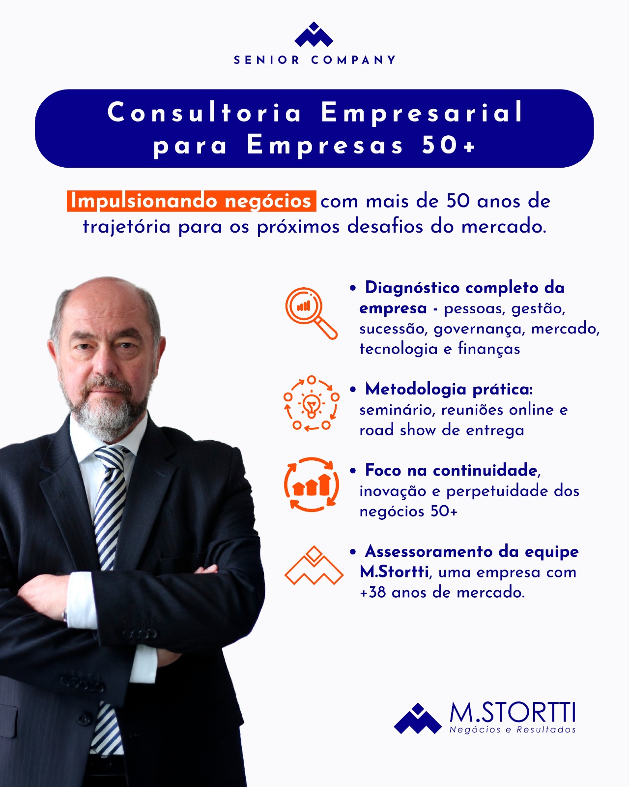 Visando atingir empresas com mais de 50 anos de atuação e através de uma abordagem personalizada, contemplando temas como inovação em processos, gestão de pessoas, transformação digital, reposicionamento de marca, sucessão familiar e sustentabilidade empresarial, a M.STORTTI passa a atuar no seu portfólio com o programa de consultoria para empresas 50+ e atuará considerando diagnóstico, avaliação e orientação, adequando essas empresas ao novo momento do mercado mundial e nacional, promovendo o impulso necessário em seus negócios.